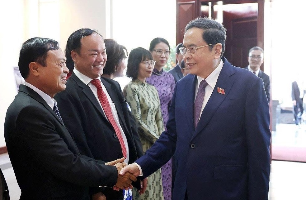Ông Phạm Văn Hùng (Tên Lào là Khamhoung Xaychaleun)- Chủ tịch Tổng hội Người Việt Nam tại Lào vinh dự bắt tay Chủ tịch Quốc hội Trần Thanh Mẫn
