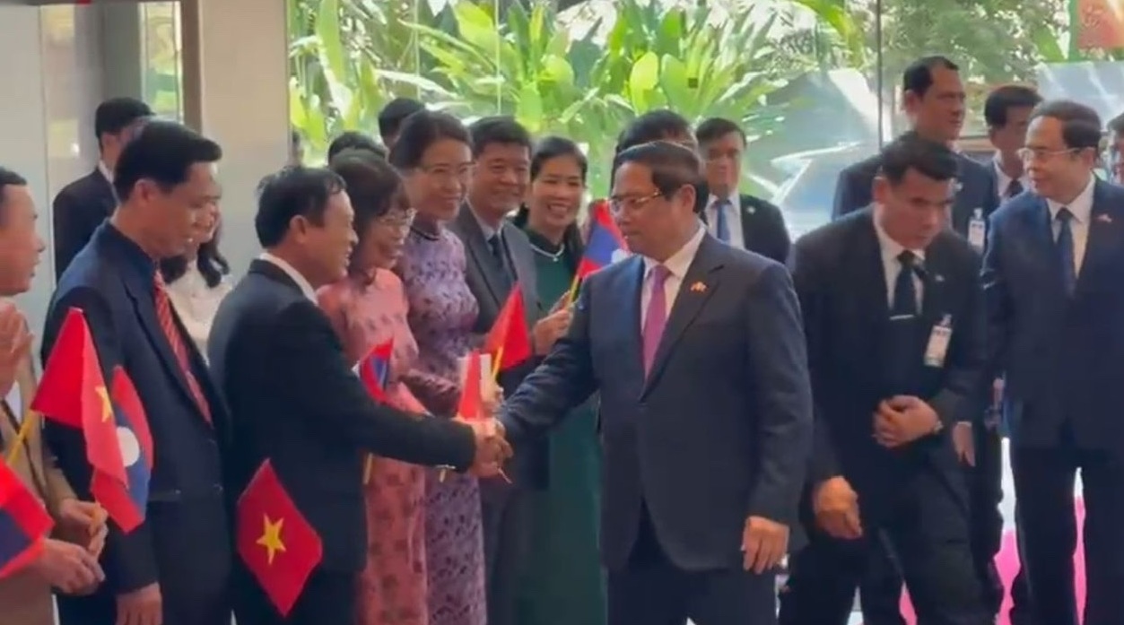 Ông Phạm Văn Hùng (Tên Lào là Khamhoung Xaychaleun)- Chủ tịch Tổng hội Người Việt Nam tại Lào và bà con Việt kiều đón Thủ tướng Phạm Minh Chính