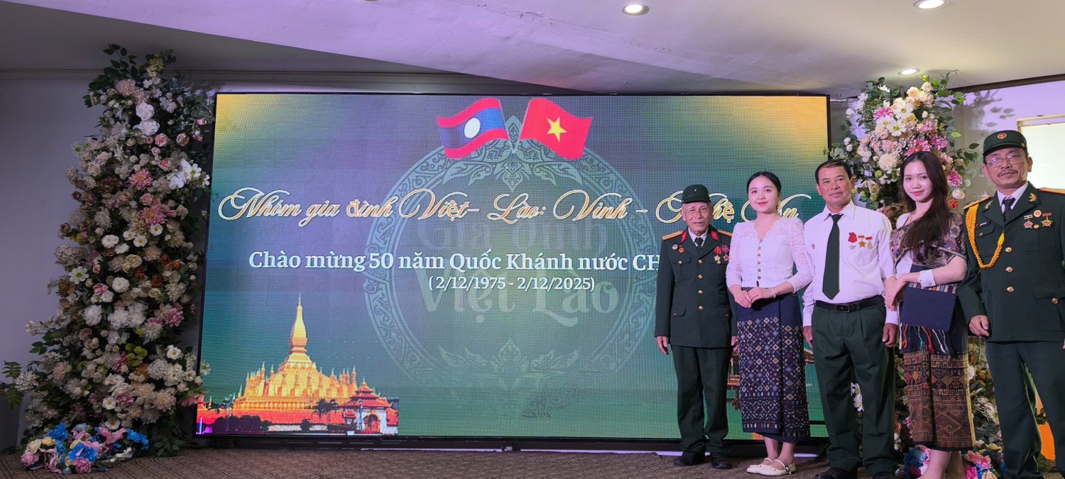 Nhân kỉ niệm 50 năm Quốc khánh CHDCND Lào (02/12/1975-02/12/2025), Nhóm gia đình Việt- Lào tỉnh Nghệ An tổ chức liên hoan gặp mặt chúc mừng các lưu học sinh sinh viên Lào đang theo học tại các trường Đại học Cao đẳng trên địa bàn tỉnh Nghệ An. Tham dự có ông Vi Tố Định- Phó chủ tịch Hội hữu nghị Việt Nam- Lào tỉnh Nghệ An, ông Chu Văn Kiều- Trưởng BLL Quân tình nguyện và chuyên gia Quân sự Việt Nam; các gia đình bố mẹ Việt- Lào cùng các em sinh viên Lào.