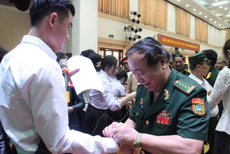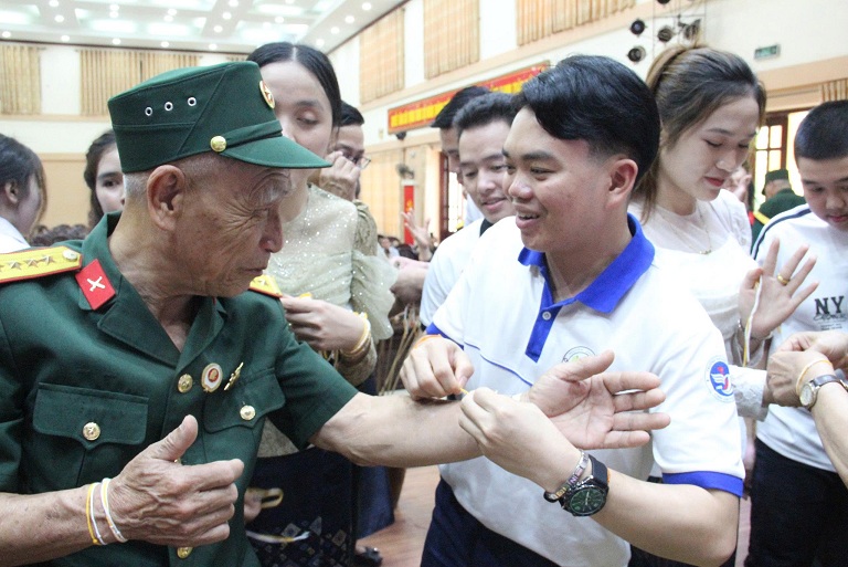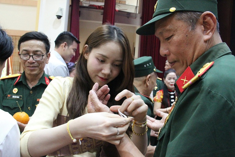 Trong không gian ấm cúng của những mái nhà Việt, các sinh viên Lào được đón Tết như chính ở quê hương mình. Những “cha mẹ Việt” chuẩn bị mâm cơm, dọn dẹp nhà cửa, trang trí hoa tươi, tất cả đều mang một thông điệp giản dị: “Các con không hề xa nhà.” Các sinh viên Lào đã làm lễ buộc chỉ cổ tay cho các vị khách và bố mẹ nuôi, tiếng cười nói rộn ràng, những cái ôm thân thiết, những lời chúc bình an đầu năm khiến khoảng cách địa lý dường như tan biến. Với nhiều sinh viên Lào, cảm nhận được một gia đình thứ hai ấm áp. Tại đây, mọi người được trải nghiệm nghi lễ té nước – biểu tượng của sự thanh sạch và may mắn; nghi thức không thể thiếu là lễ buộc chỉ cổ tay. Những sợi chỉ trắng, vàng được buộc nhẹ nhàng lên tay nhau, kèm theo lời chúc sức khỏe, học tốt và gặp nhiều may mắn. Khoảnh khắc ấy, không chỉ là một phong tục, mà còn là sự gắn kết thiêng liêng – nơi tình cảm giữa người Việt và sinh viên Lào trở nên gần gũi như ruột thịt; ở Nghệ An còn là dịp để hai nền văn hóa hòa quyện. Trong ngày vui, các bố mẹ Việt và sinh viên Lào đã cùng múa Lăm Vông uyển chuyển, cùng hát những bài ca về tình Việt Nam - Lào tạo nên không khí thân thiện, cởi mở trong bức tranh văn hóa đa sắc màu đậm đà nghĩa tình Việt Lào, góp phần nuôi dưỡng mối quan hệ thủy chung, son sắt mà các cựu chiến binh đã hoàn thành sứ mệnh nghĩa vụ Quốc tế cao cả.
