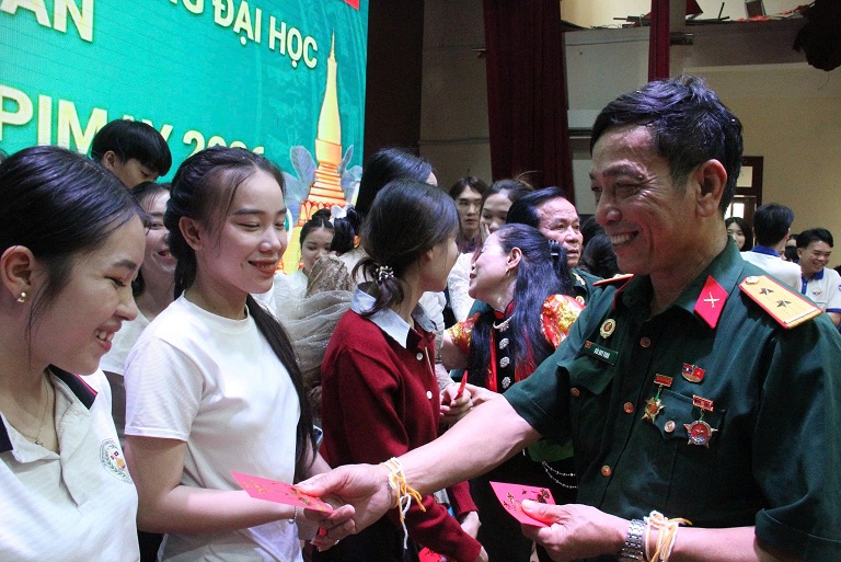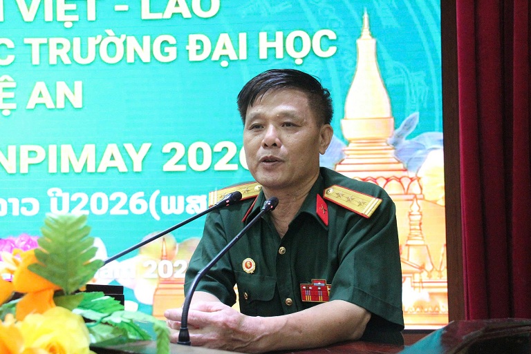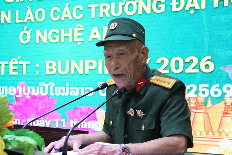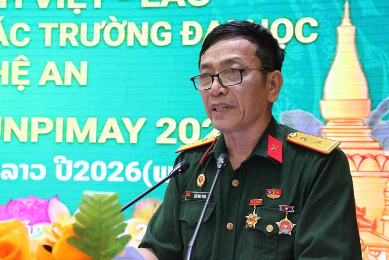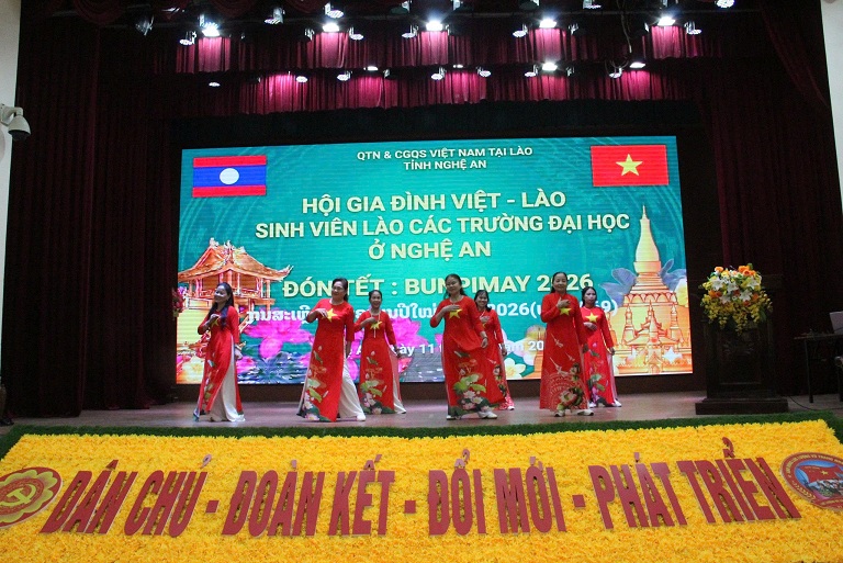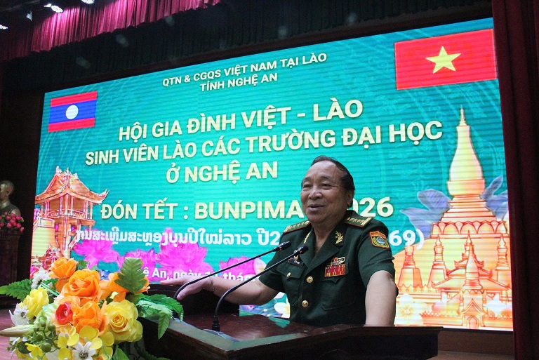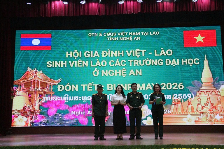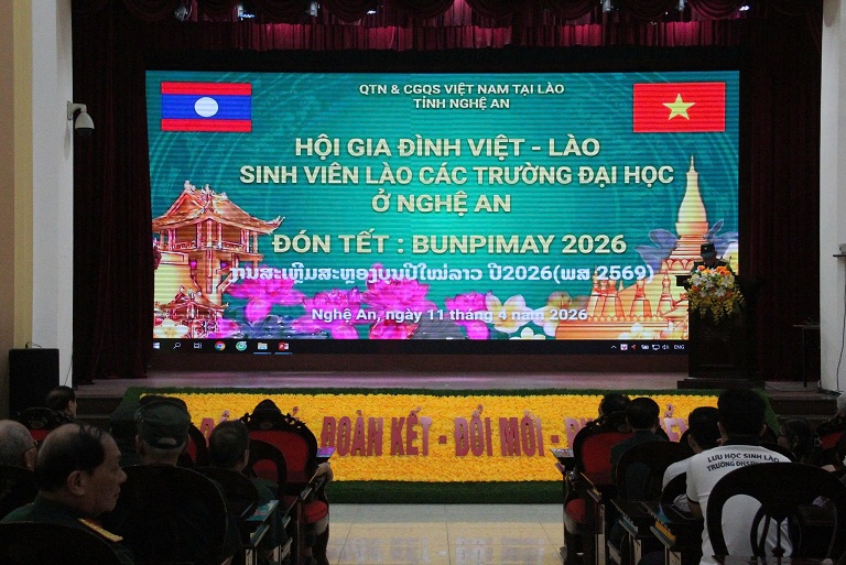 Sáng 11/4, tại Hội trường Bộ chỉ huy Quân sự tỉnh Nghệ An diễn ra Lễ đón Tết Bounpimay của Hội Gia đình Việt - Lào với sinh viên các Trường Đại học trên địa bàn tỉnh Nghệ An. Cùng tham gia vui Tết Lào 2026 có Đại tá Vi Tố Định - Phó chủ tịch Hội Việt Nam- Lào tỉnh Nghệ An, đại diện Ban Liên lac cựu Quân tình nguyện và Chuyên gia Việt Nam giúp cách mạng Lào tỉnh Nghệ An, Thanh Hóa, Hà Tĩnh, các gia đình nhận kết nghĩa con nuôi là sinh viên Lào và các sinh viên Lào.