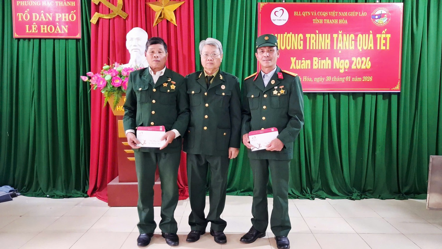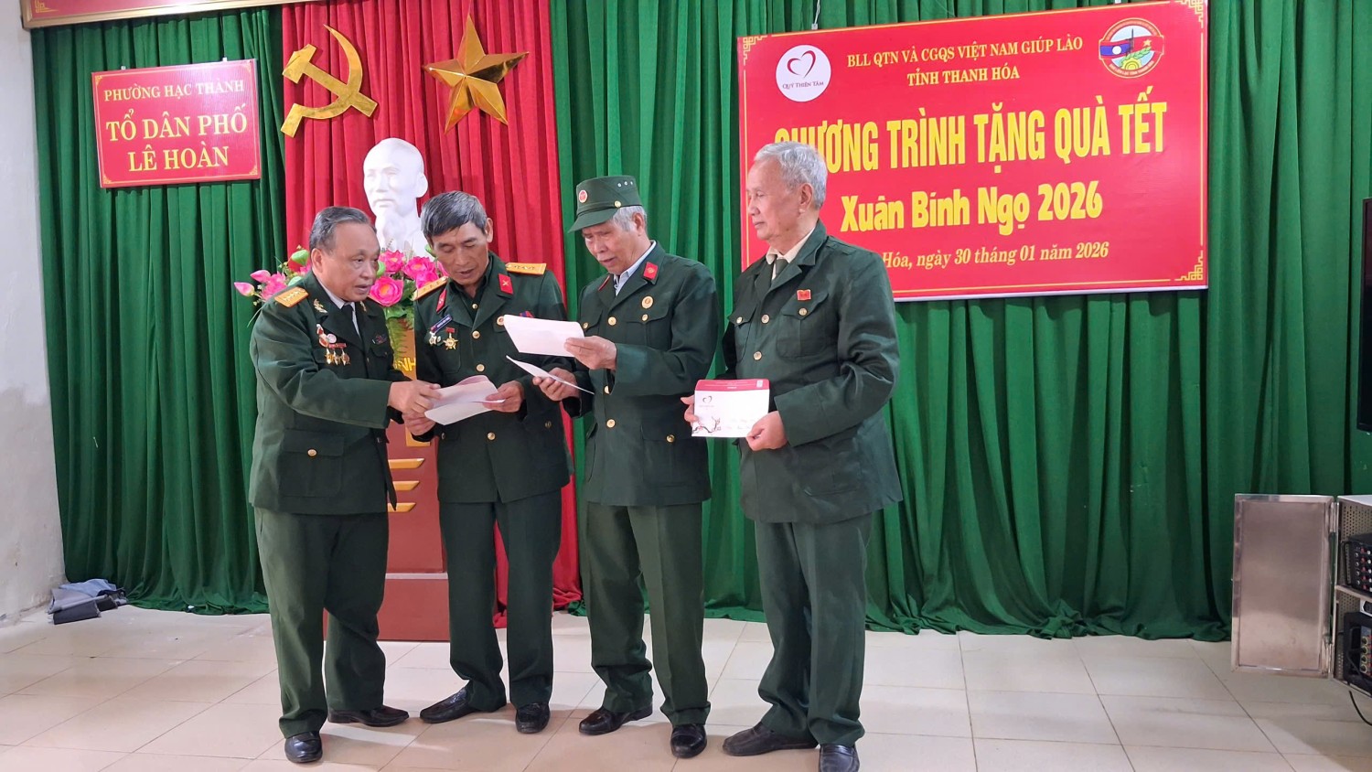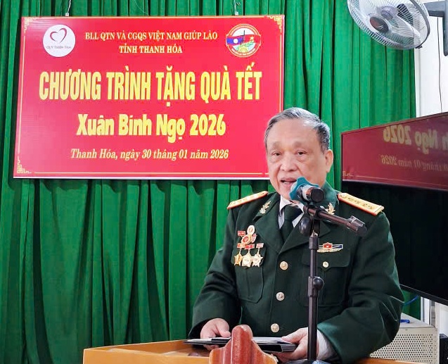 Sáng 30/01/2026, tại Tổ dân phố Lê Hoàn, phường Hạc Thành, tỉnh Thanh Hóa, đại diện Ban Liên lạc Cựu Quân tình nguyện và Chuyên gia Việt Nam giúp Lào Toàn quốc phối hợp Ban liên lạc tỉnh Thanh Hóa và nhà tài trợ Tập đoàn Vingroup trao 74 suất quà cho Cựu chiến binh Quân tỉnh nguyện và Chuyên gia Việt Nam giúp Lào trên địa bàn toàn tỉnh Thanh Hóa.