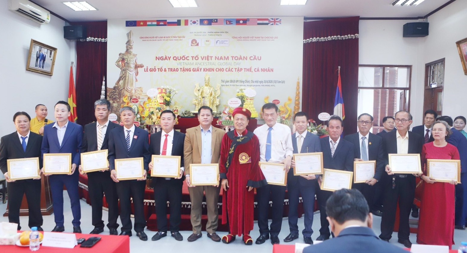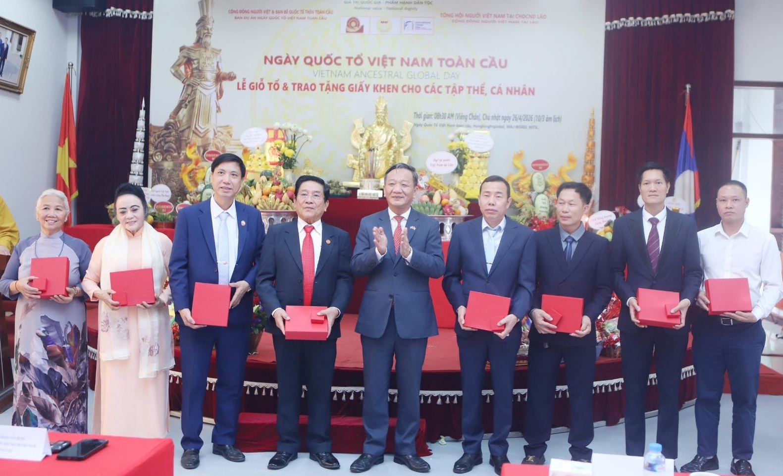 Sáng 26/4/2026 (tức ngày 10 tháng 3 âm lịch), tại trụ sở Tổng hội ở thủ đô Viêng Chăn (Vientiane) nước bạn Lào, Tổng hội người Việt Nam tại Lào trang trọng tổ chức Lễ vọng Giỗ Tổ Hùng Vương 2026. Tham dự buổi lễ có Đại sứ Nguyễn Minh Tâm và Phu nhân