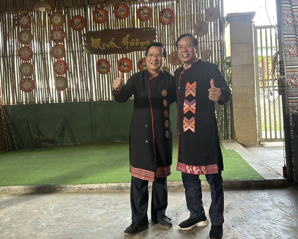 Ông Nguyễn Hồng Kỳ - Phó chủ tịch Thường trực Liên hiệp các Tổ chức hữu nghị tỉnh Nghệ An (bên phải) và ông Hồ Ngọc sỹ, trải nghiệm trang phục Thái cổ trong chuyến đi.