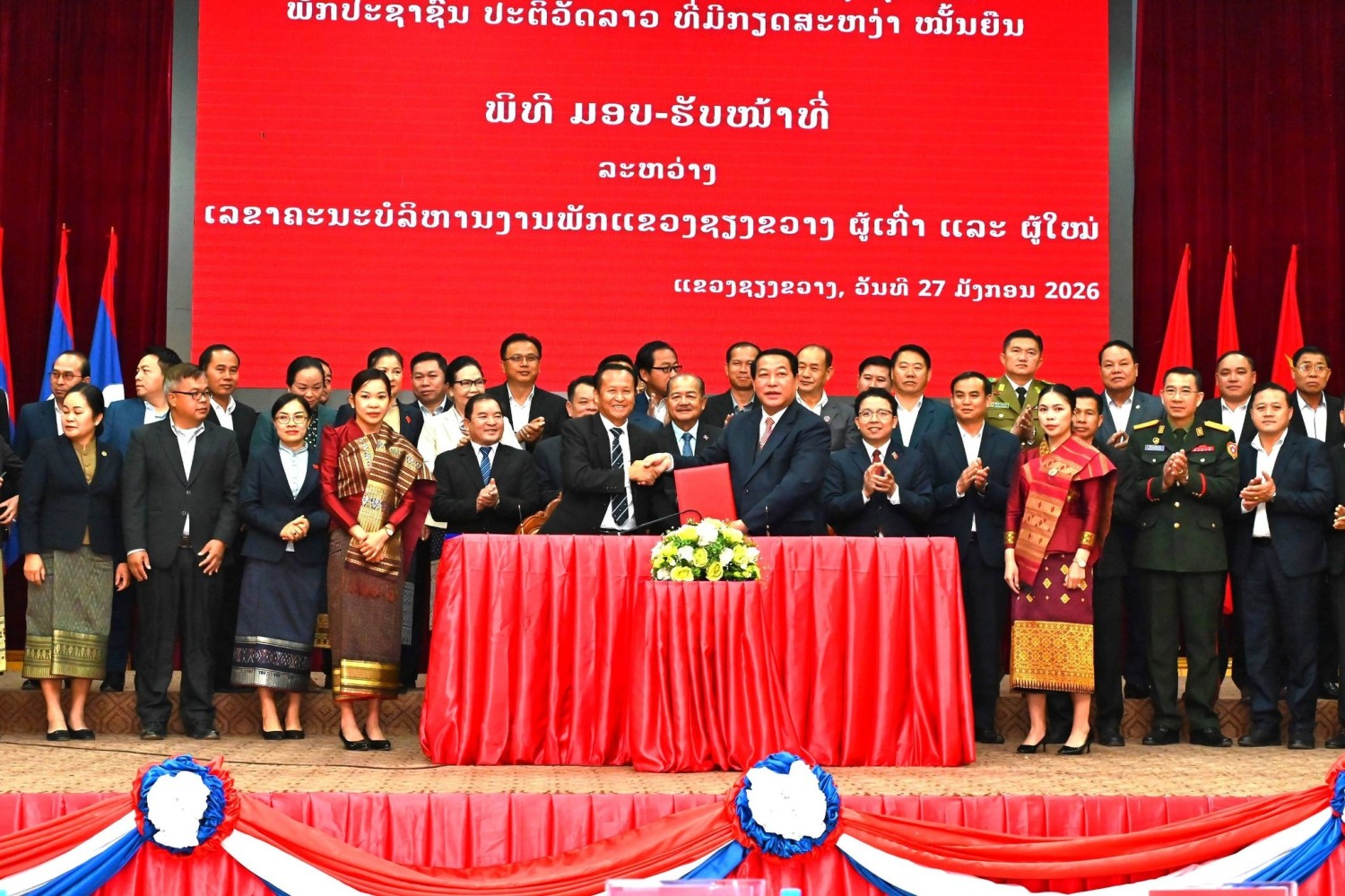Ngày 27/01/2026, tại Văn phòng Chính quyền tỉnh Xiengkhouang diễn ra lễ bàn giao chức vụ Bí thư Tỉnh ủy Xiengkhouang cũ và mới với sự chủ trì của đồng chí Giáo sư Kikeo Khaykhamphithoun, Ủy viên Bộ Chính trị- Chủ tịch Mặt trận Lào Xây dựng đất nước.