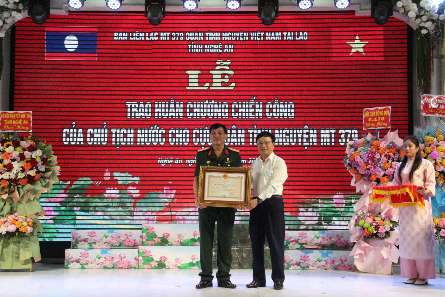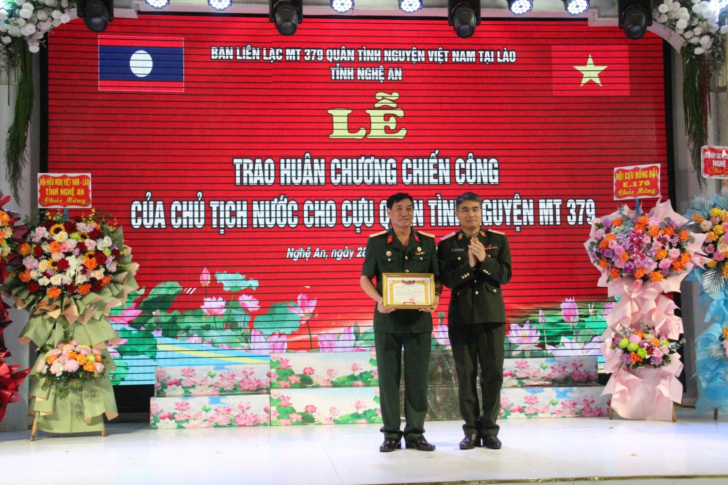 Sáng 28/3, tại phường Trường Vinh, tỉnh Nghệ An, Ban Liên lạc Mặt trận 379 Bắc Lào tỉnh Nghệ An tổ chức Lễ kỷ niệm 47 năm ngày thành lập và đón nhận nhiều phần thưởng cao quý của Chủ tịch nước trao tặng gồm Huân chương Chiến công Hạng hai cho CCB Vương Bình Minh- Trưởng Ban liên lạc và Huân chương Chiến công Hạng ba cho 12 cá nhân là cựu Quân tình nguyện Việt Nam giúp cách mạng Lào.